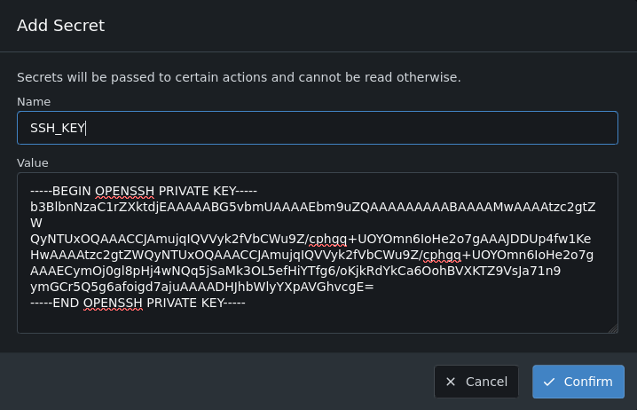 If we zoom in on the SSH_KEY secret, it could be filled out like this: