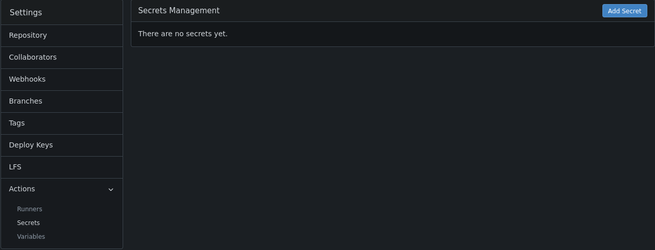 Gitea Actions (and other CI/CD systems i guess), have a an ace up their sleeves for helping us with handling sensitive information. If we navigate to Settings > Actions > Secrets in the level we our runner is registered, we can register secrets, that we can reference in our workflow files.