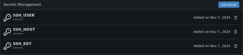 Once we have saved our secrets, we will be able to see them in the Gitea UI, but we will not be able to see their contents any longer, as this is stored encrypted in Gitea. If we at any point need to edit a secret, we need to delete it, and create it again.